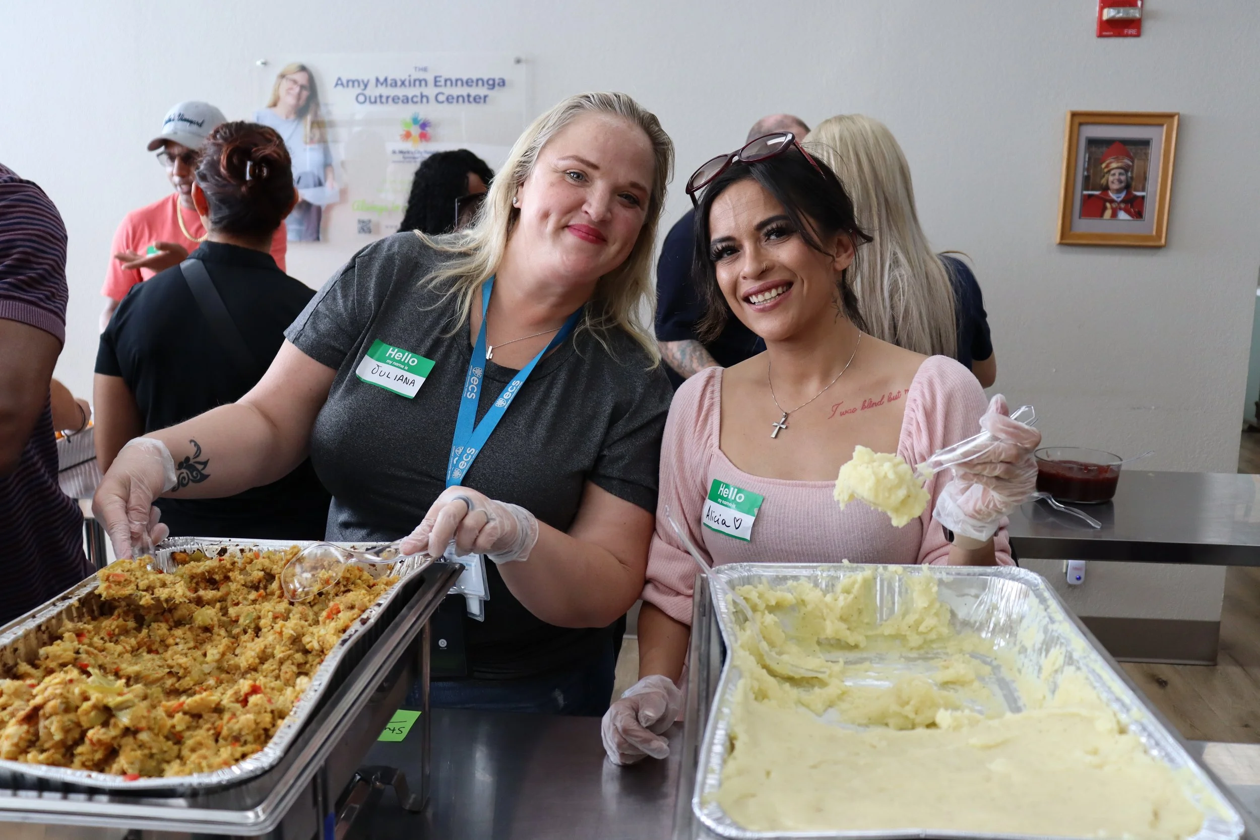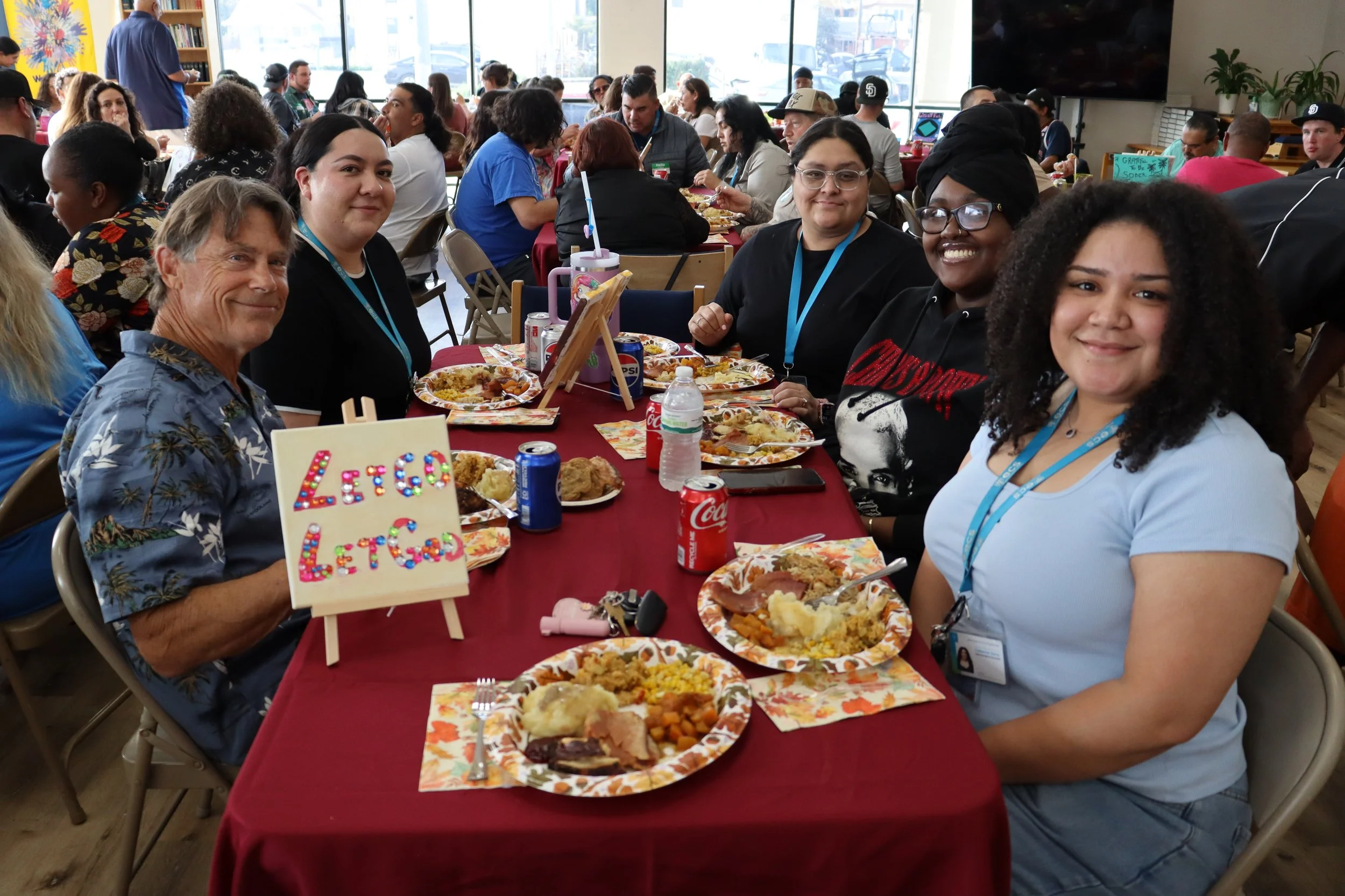 Clients, volunteers, staff, and leadership enjoy a Thanksgiving-style feast together. November 2025.