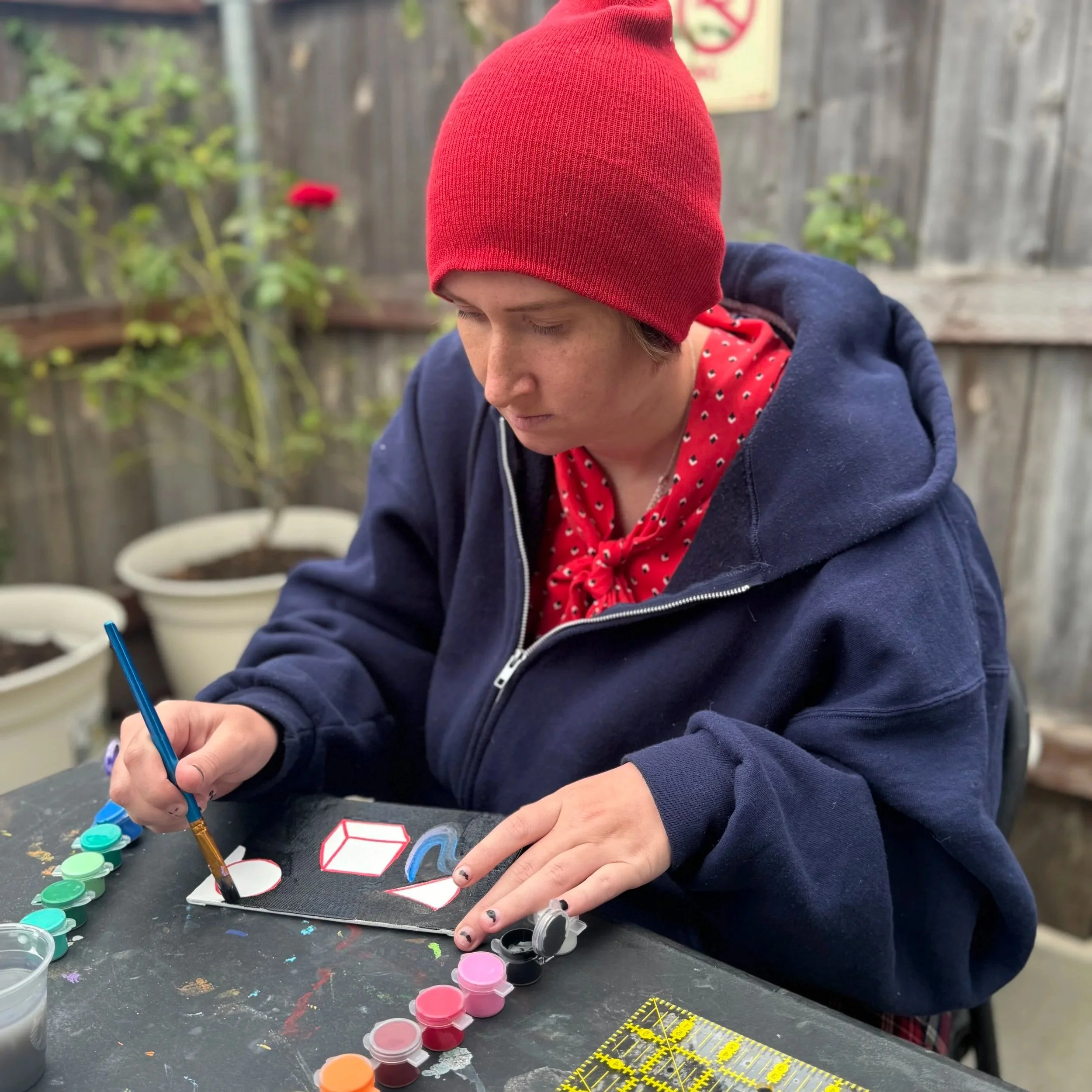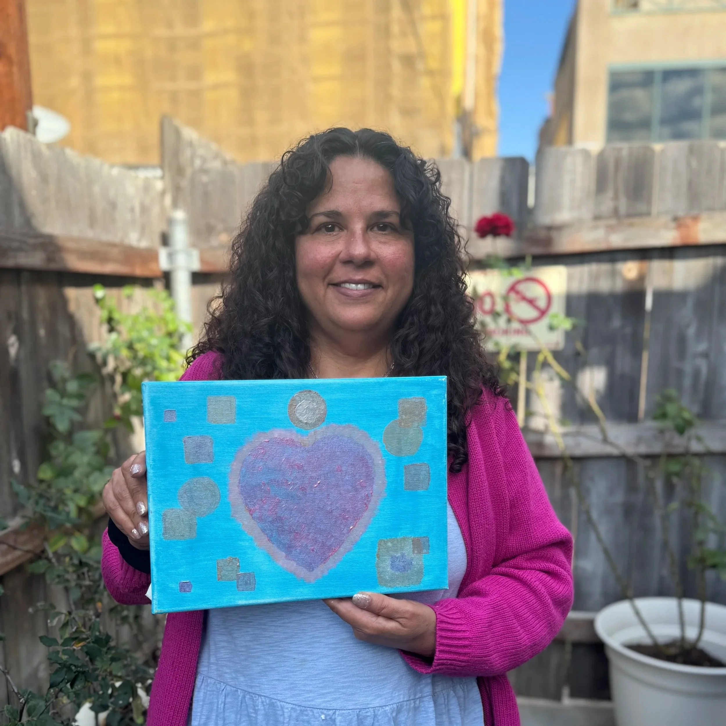 Resident with her artwork. March 2026.